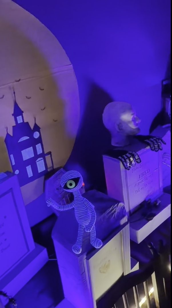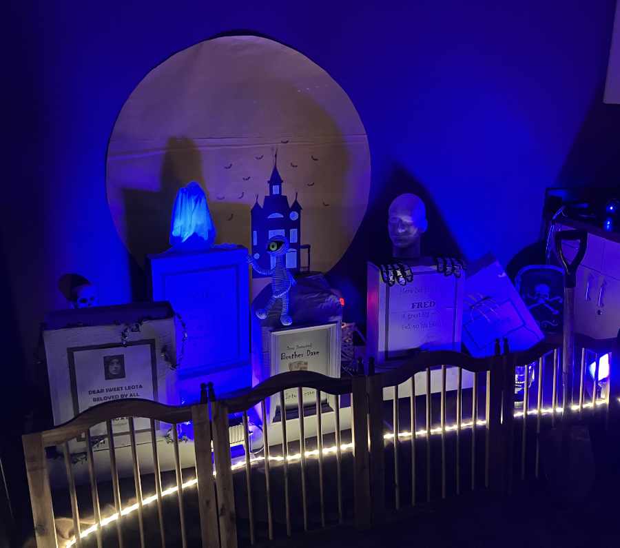 Judith and Jerry wanted to create a haunted mansion experience for the Edwards Center residents, but wanted to keep it at a “Disney” experience level of scare. So, why not make a down-sized “Disney Haunted Mansion”???