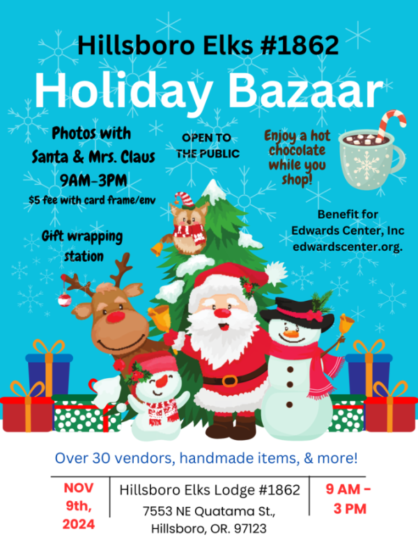 In 2024, Judith received permission from the Hillsboro Elks Lodge #1862 to host a November 2024 holiday bazaar, with the proceeds to be given to the Edwards Center. Judith was the overall coordinator and designer of the event, though it took a lot of work from a host of helpers to pull it all off.