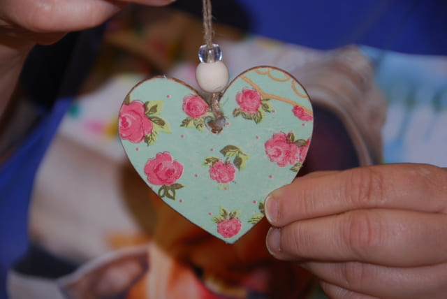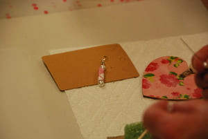 Back to our class, our finished project was a pair of paper bead earrings.  As you can see in the photos, they turned out just great.  We added beads and I put the earrings together.  A wooden heart covered in a paper napkin was also added to the crafting lesson.  We placed the earrings on an earring display card, added the decorated wooden heart, a candy treat to floral paper cups and saucer.  The paper cup and items were placed into a clear plastic bag and tied with a bow.  The students were thrilled with their finished projects.